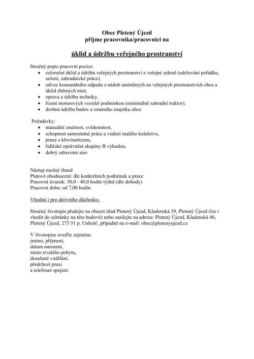 Obec Pletený Újezd přijme pracovníka/pracovnici na úklid a údržbu veřejného prostranství.