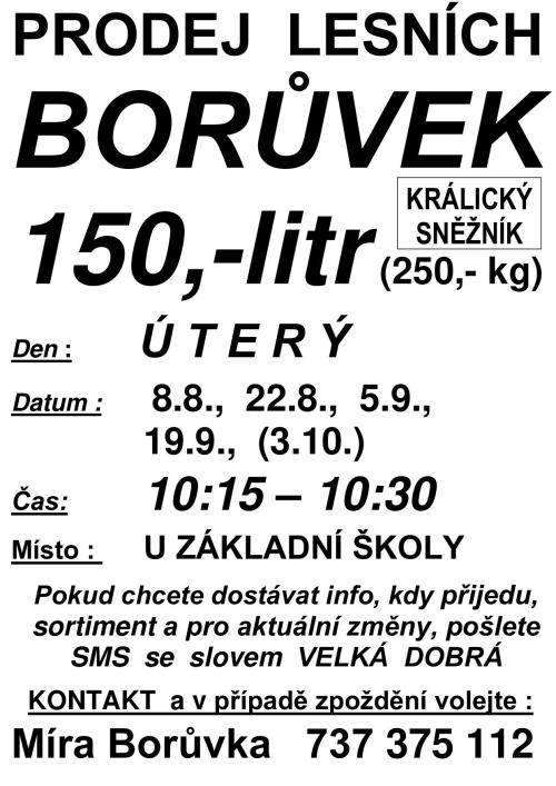 Prodej borůvek je v termínech 8.8., 22.8., 5.9., 19.9. případně 3.10. vždy na parkovišti u základní školy v čase 10:15 až 10:30 hod. Cena 150,- CZK/litr.