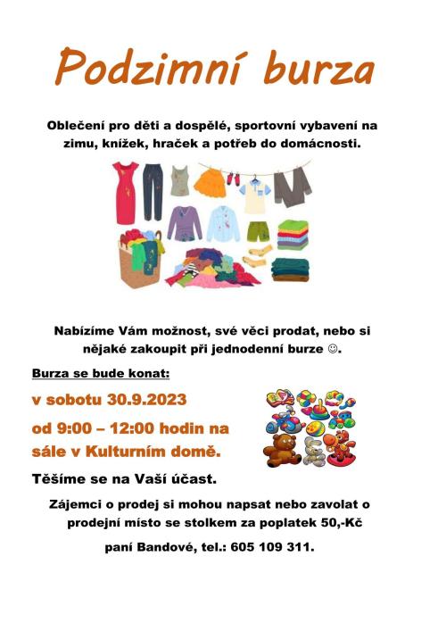 Podzimní burza v kulturním domě 30.9.2023 od 9:00 - 12:00 h.