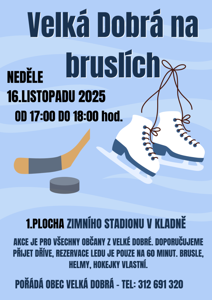 Obec Velká Dobrá pořádá v neděli 16. listopadu 2025 od 17:00 do 18:00 hodin akci bruslení na zimním stadionu v Kladně. Akce je určena pro všechny občany Velké Dobré. Doporučujeme příjezd s dostatečným předstihem, neboť rezervace ledu je pouze na 60 minut. Účastníci si musí přinést vlastní brusle, helmy a hokejky.