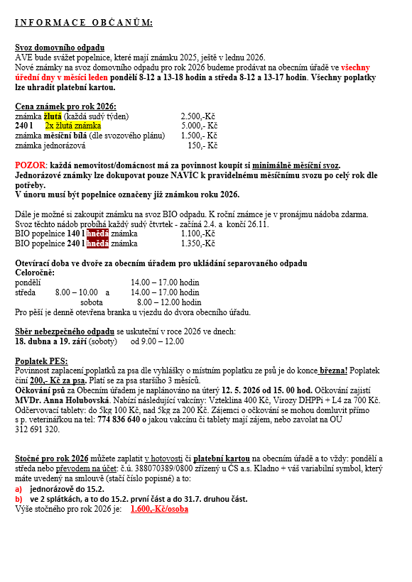 Nové známky na svoz domovního odpadu pro rok 2026 budeme prodávat na obecním úřadě ve všechny úřední dny v měsíci leden pondělí 8-12 a 13-18 hodin a středa 8-12 a 13-17 hodin. Všechny poplatky lze uhradit platební kartou.