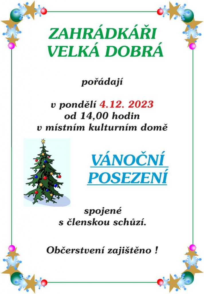 Zahrádkáři Velká Dobrá pořádají 4. 12. od 14. hod v kulturním domě Vánoční posezení spojené s členskou schůzí. Srdečně Vás zveme.