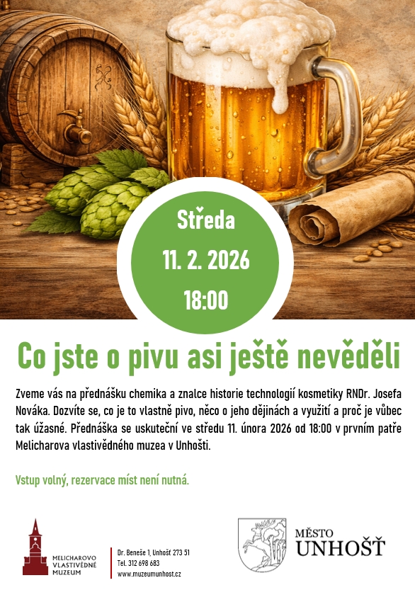 Zveme vás na zajímavou přednášku o pivu, kterou povede RNDr. Josef Novák, chemik a odborník na historii technologií kosmetiky. Během této přednášky se dozvíte, co všechno obnáší pivo, jeho fascinující dějiny a využití. Přednáška proběhne ve středu 11. února 2026 od 18:00 v prvním patře Melicharova vlastivědného muzea v Unhošti. Vstup je volný a rezervace míst není nutná, takže neváhejte a přijďte si poslechnout zajímavosti o tomto oblíbeném nápoji.