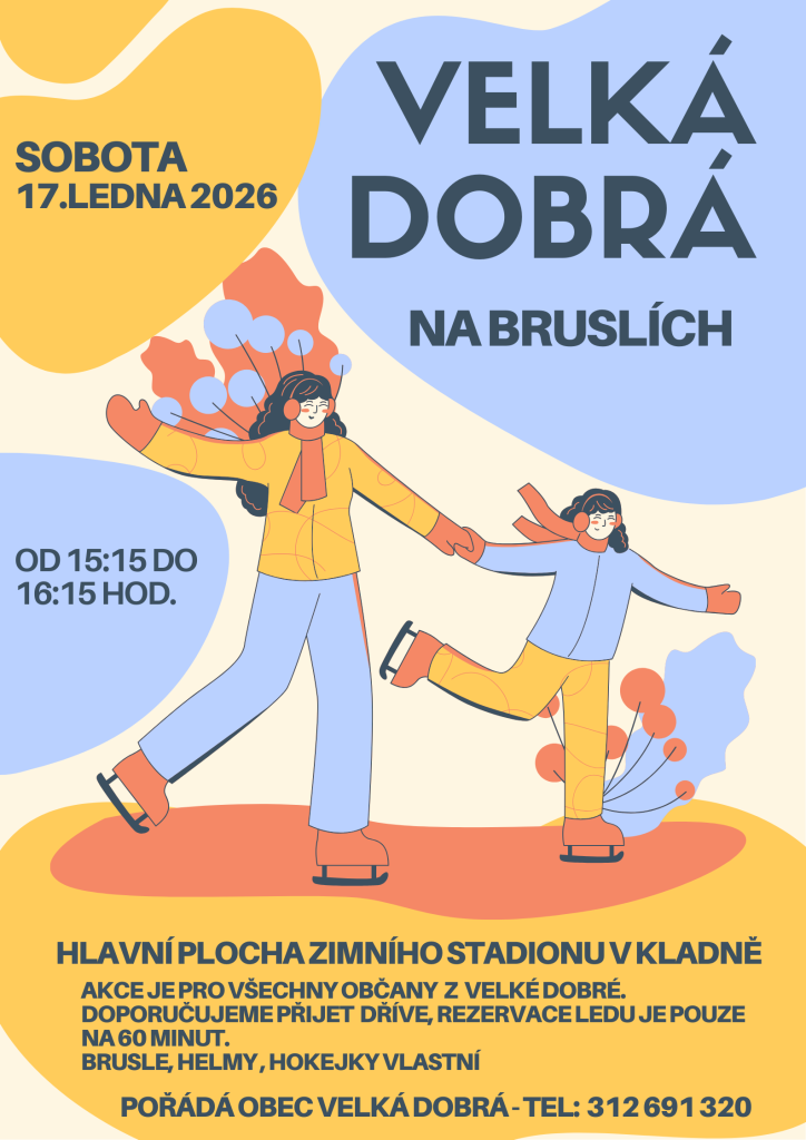 Zveme všechny občany Velké Dobré na sobotní bruslení, které se uskuteční 17. ledna 2026 od 15:15 do 16:15 hodin na hlavní ploše zimního stadionu. Akce je určena pro všechny, kdo si chtějí užít zimní radovánky na ledě. Doporučujeme, abyste přišli dříve, protože rezervace ledu je možná pouze na 60 min